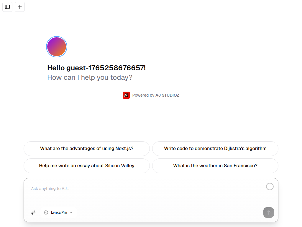 AJ STUDIOZ CHAT is an AI chat platform supporting guest access, powered by Lynxa models for versatile interactions including coding assistance, essay writing, technical queries, and weather checks.