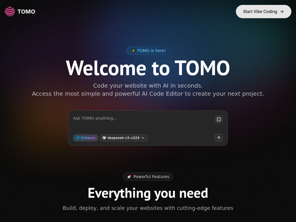 TOMO is an AI-powered code editor that enables users to code and build websites in seconds, featuring multi-page support, auto-deployment, free hosting with global CDN, open-source AI models like Llama and Mistral, Hugging Face integration, and optimized performance.