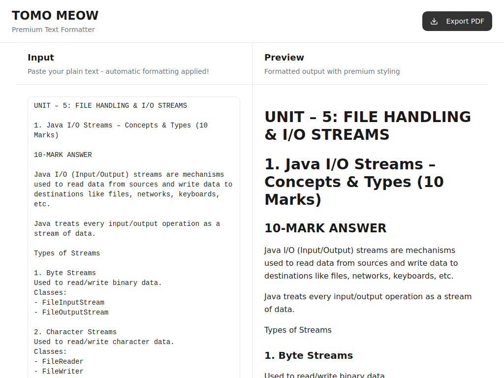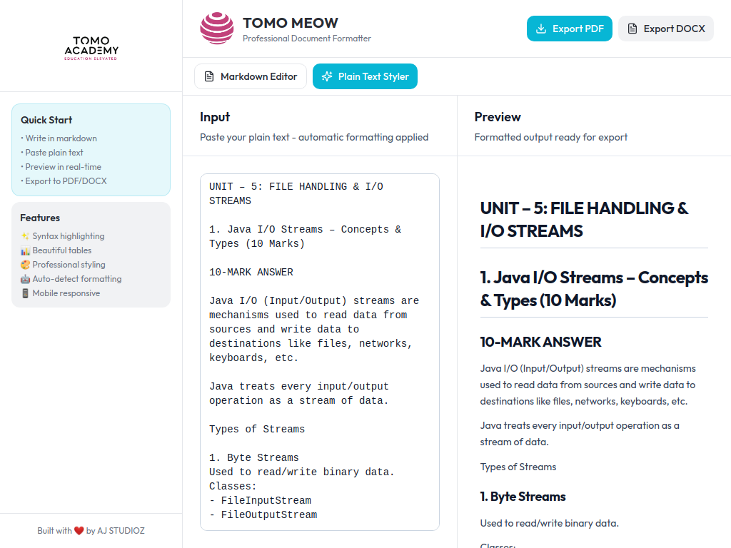 TOMO MEOW by AJ STUDIOZ is a professional document formatter tool that converts plain text or Markdown into styled documents with real-time preview and exports to PDF or DOCX, ideal for notes, code, and reports like Java I/O Streams tutorials.