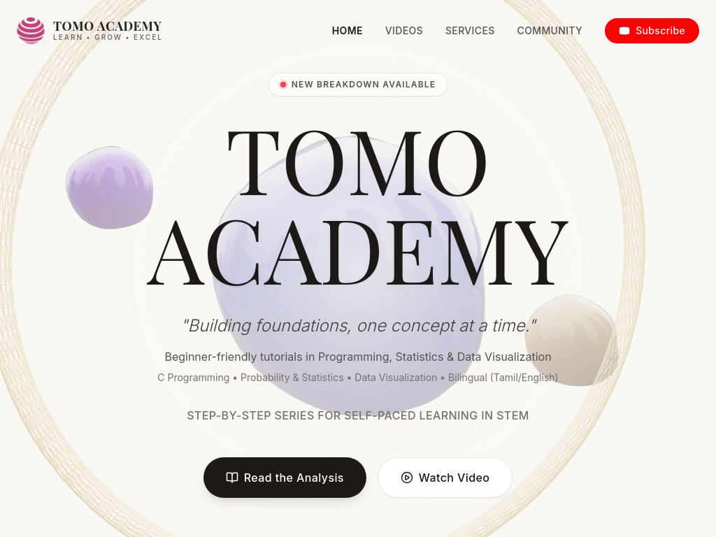 TOMO ACADEMY is a beginner-friendly educational platform offering free, step-by-step tutorials in C programming, probability & statistics, and data visualization, delivered bilingually in Tamil and English via progressive video series for self-paced STEM learning.