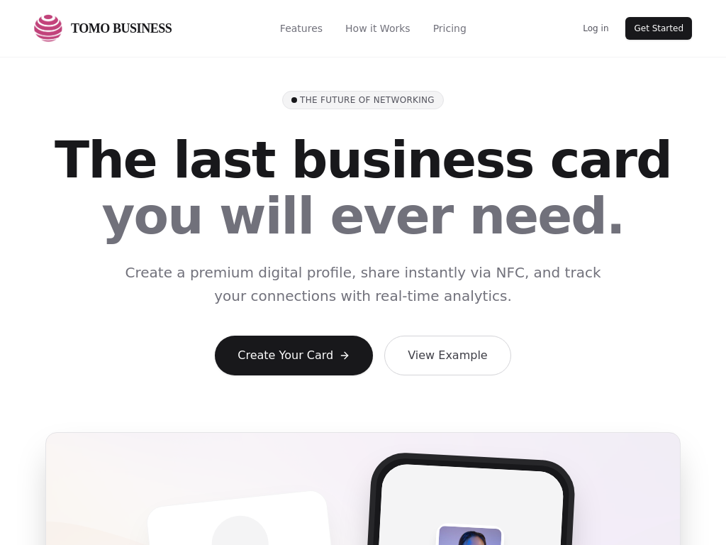 TOMO BUSINESS is a modern networking tool for creating premium digital profiles that replace physical cards, enabling instant NFC sharing on any smartphone without apps, customizable domains like tomo.business/yourname, and real-time connection analytics.
