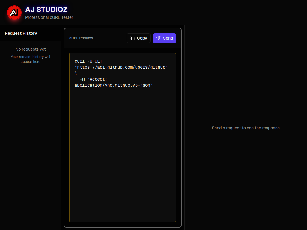 cURL Tester by AJ STUDIOZ is a professional online tool for inputting, previewing, sending cURL commands, and viewing responses to assist developers in testing and debugging API requests efficiently.
