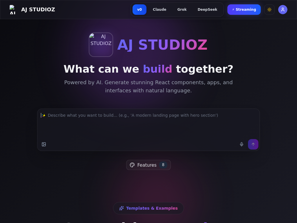 AJ STUDIOZ internal dev tool is an AI-powered tool for generating stunning React components, apps, and interfaces using natural language prompts, with streaming support and multiple models including v0, Claude, Grok, and DeepSeek.