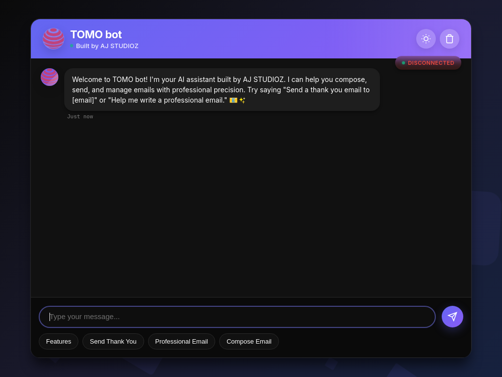 TOMO bot is an AI assistant developed by AJ STUDIOZ that helps users compose, send, and manage professional emails efficiently, with commands like 'Send a thank you email to [email]' or 'Help me write a professional email'.